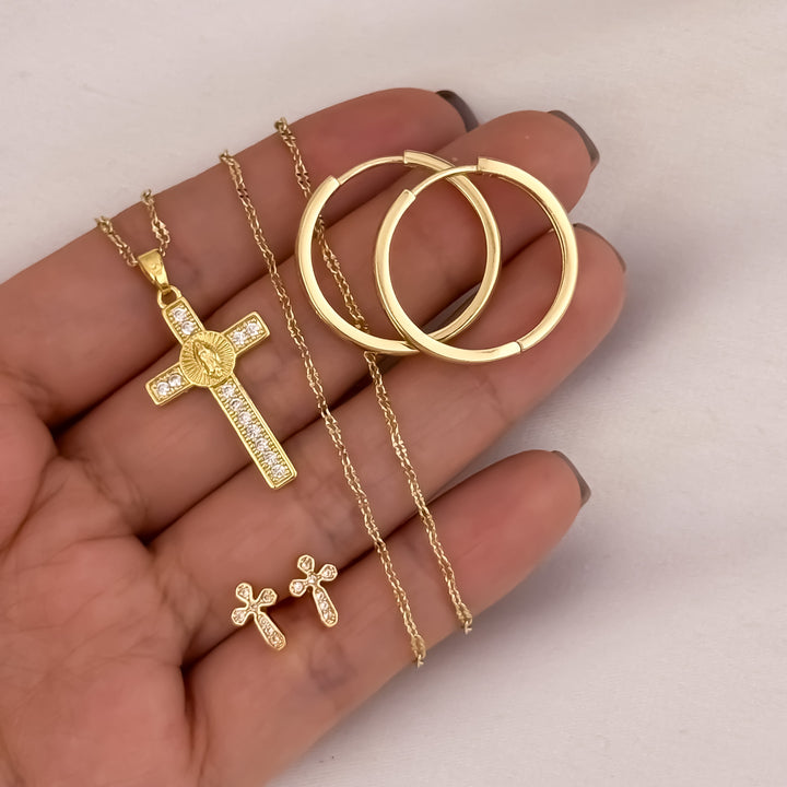 Cadena Tejido Crispeta de Dama de 45cm de 2mm + Cruz Virgen de Guadalupe + Topo Cruz + Candongas Tubular en Oro laminado 18k con Garantia de por vida