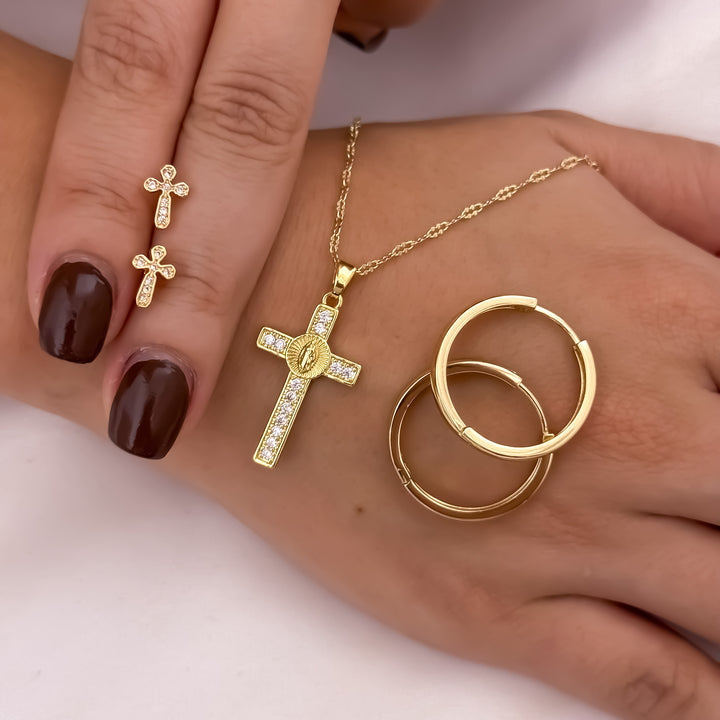 ✨ Amuleto protector completo: Cruz + Virgen + candongas + topos en una sola propuesta llena de simbolismo. 💎 Oro laminado 18K de alta calidad: Brillo intenso, tacto suave, apariencia de oro sólido. Garantía de por vida en el color: Su acabado profesional garantiza que no perderá su tono dorado, manteniendo la apariencia del oro 18K real.