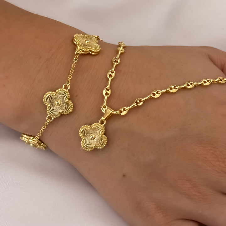 El diseño inspirado en Van Cleef no es solo belleza visual: es un símbolo de energía positiva. El dije de trébol representa suerte, esperanza, fe y amor. La pulsera a juego aporta un toque de sofisticación con intención, haciendo de cada pieza algo más que un simple accesorio. Este conjunto eleva tu look y transmite un mensaje de buen gusto y fuerza interior.