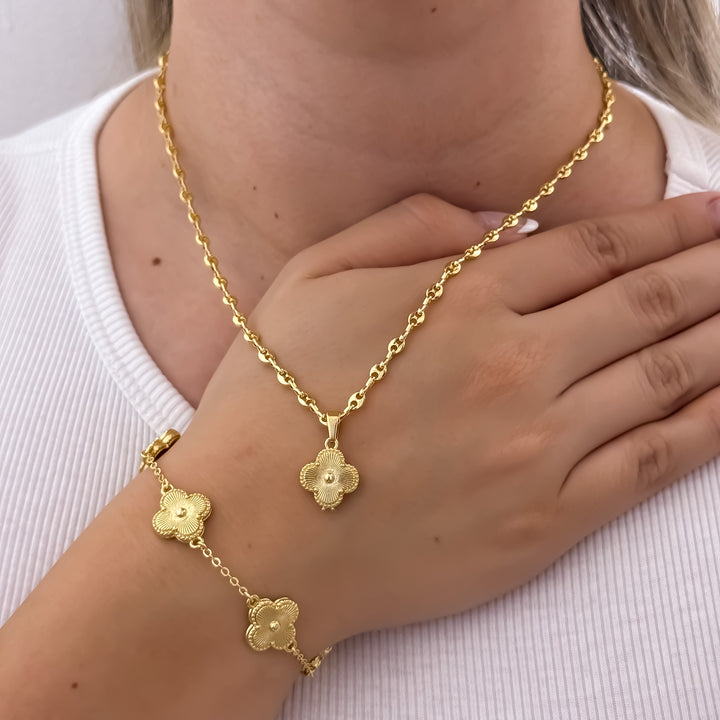 Cadena Tejido Gucci de Dama de 45cm de 3mm + Dije de Van Cleef + Pulsera Van Cleef en Oro Laminado 18k con Garantia de por vida