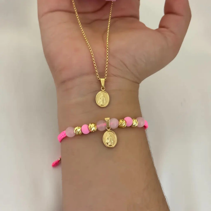 Conjunto De Dama Con Cadena De Tejido Aros Y Dije De La Virgen Milagrosa + Manilla Con Dije De La Virgen Milagrosa