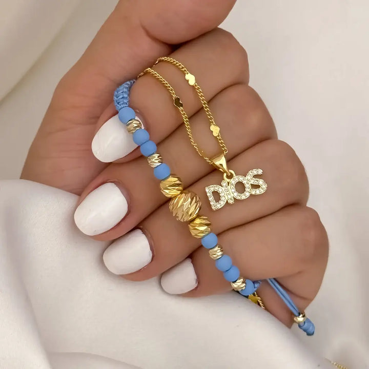 Conjunto De Dama Con Cadena De Tejido Cubana Con Corazones, Dije De Dios Y Manilla Azul