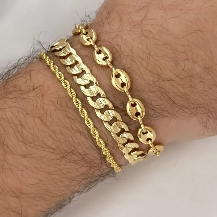 Eleva tu estilo con estas esclavas de caballero de oro laminado de 18 quilates, una expresión de lujo y distinción en cada detalle. Estas esclavas son más que una simple joya; son un símbolo de elegancia y sofisticación para el hombre moderno.
